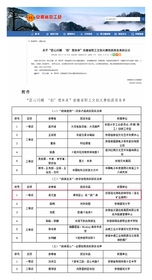 近日,从安徽省总工会传来喜讯,淮北煤电技师学院工匠大师工作室主办昌文鑫同志,在2025年安徽省“匠心闪耀 ‘创’想未来”职工文创大赛中脱颖而出,其作品荣获“皖美生活”数字创意类一等奖。