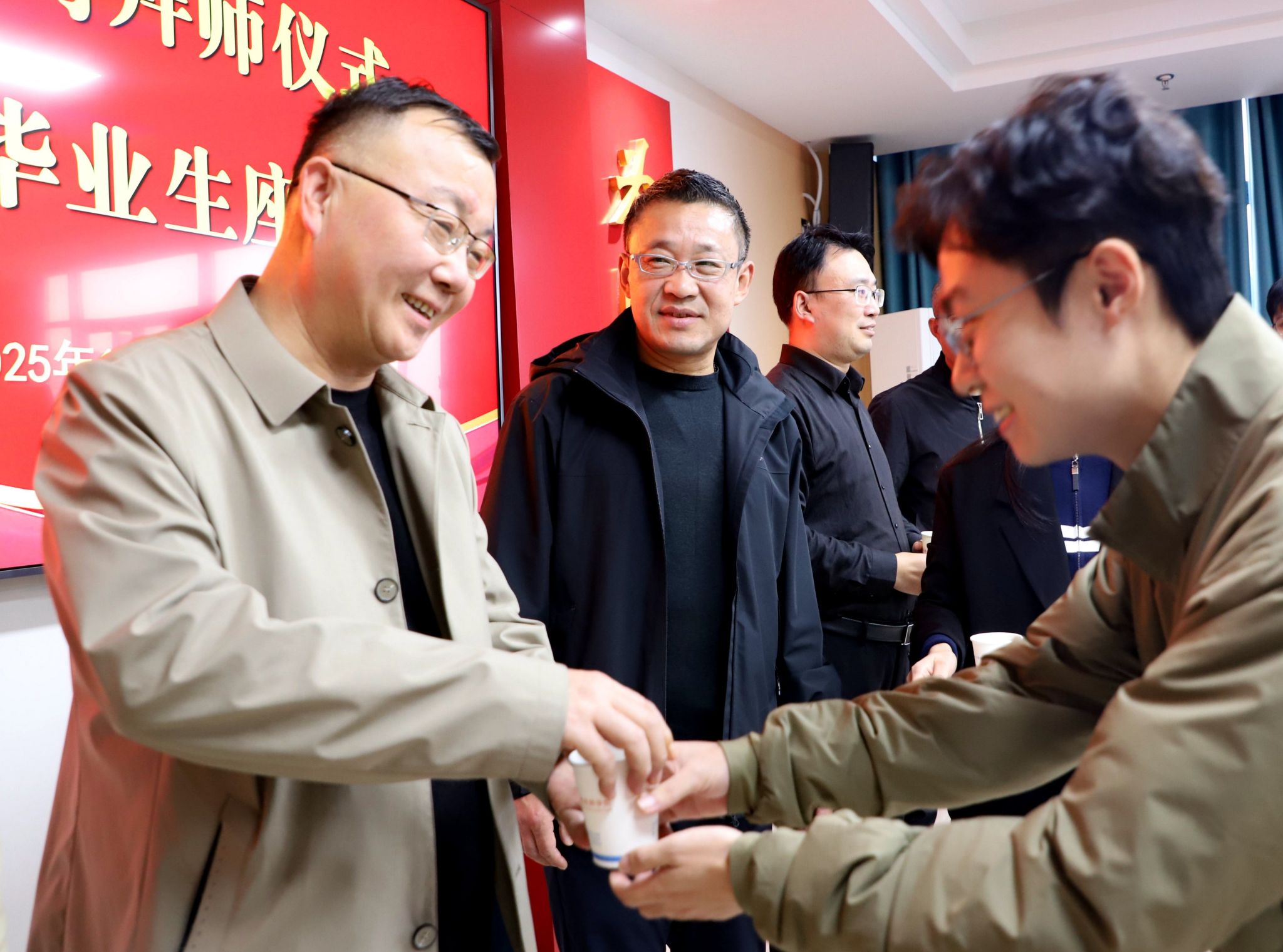 随后的敬茶环节中,年轻教师依次上前,恭敬地为自己的思想导师和业务导师双手奉上热茶。师傅们饮茶后,轻拍徒弟肩膀表示认可与鼓励,这一传统与现代交融的场景,生动诠释了师道传承的深刻内涵。