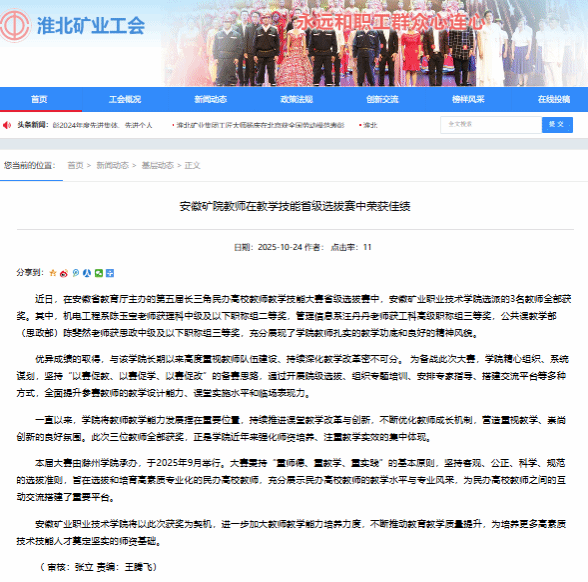 近日,在安徽省教育厅主办的第五届长三角民办高校教师教学技能大赛省级选拔赛中,安徽矿业职业技术学院选派的3名教师全部获奖。其中,机电工程系陈玉宝老师获理科中级及以下职称组二等奖,管理信息系汪丹丹老师获工科高级职称组三等奖,公共课教学部(思政部)陈斐然老师获思政中级及以下职称组三等奖,充分展现了学院教师扎实的教学功底和良好的精神风貌。