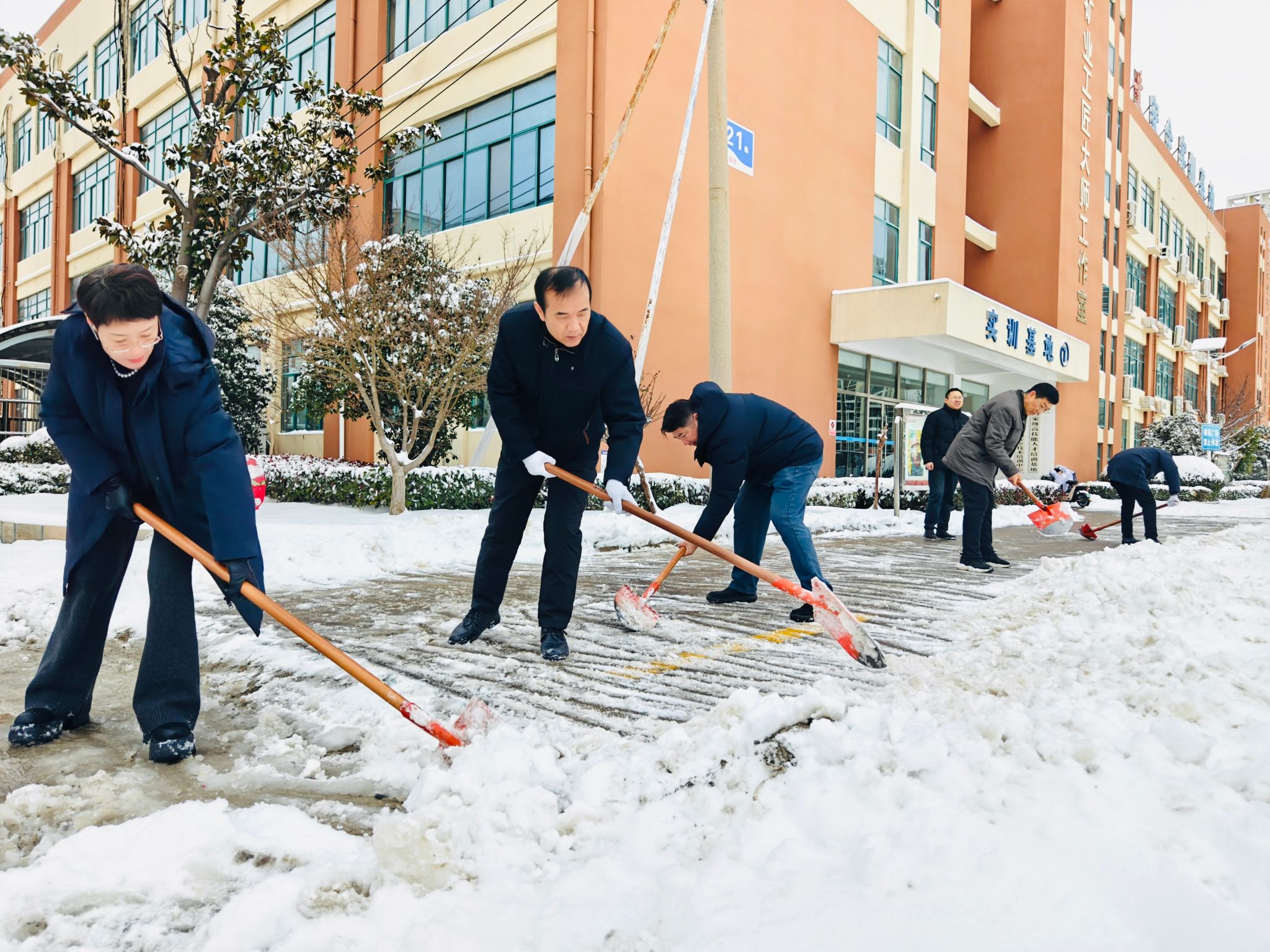 “看到党员老师们冒着雪为我们清路,心里特别暖。”留校参加技能大赛的学生,看着畅通无阻的主干道,纷纷驻足点赞。不少学生也主动加入到除雪队伍中,与党员教师们并肩作战。一时间,校园里铁锹声、扫帚声、吆喝声交织在一起,汇成了一曲冬日里的奋斗乐章。
