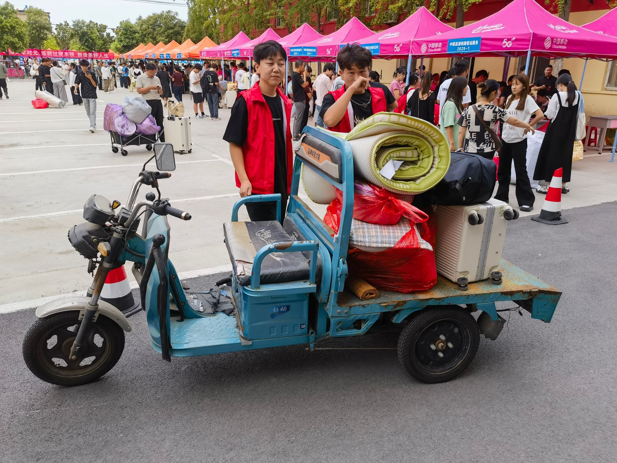 贴心运输服务,助力轻松报到。在迎新现场,新生们携带的行李较多,搬运成为一大难题。后勤党支部组织安排了三轮车运输队,志愿者们驾驶着三轮车穿梭在校园中,帮助新生将行李快速、安全地运送到宿舍区。这一贴心服务,不仅减轻了新生们的负担,还让他们初入校园就感受到了学校的关怀。