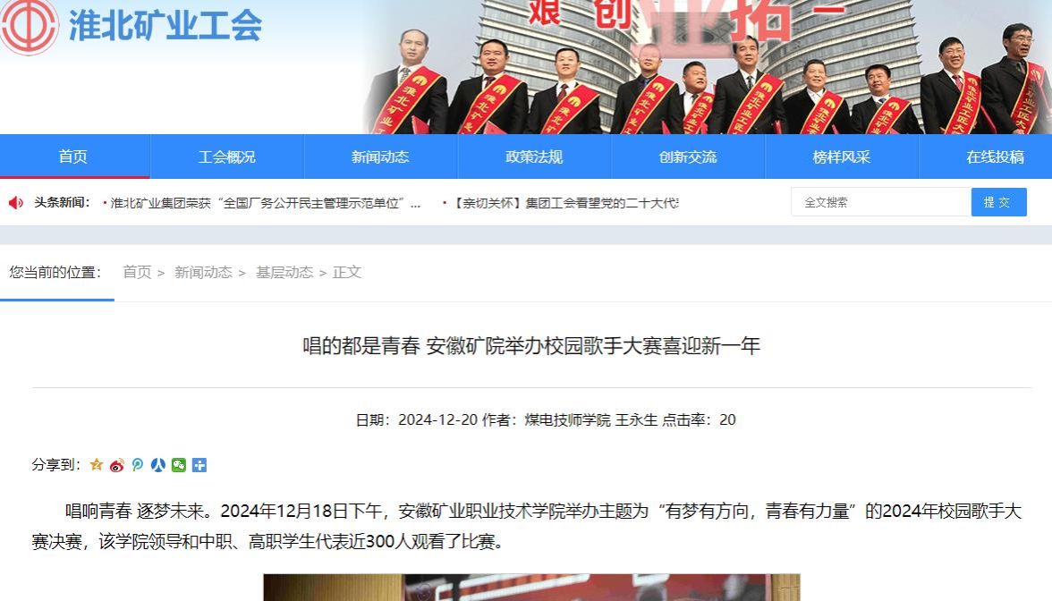 唱响青春,逐梦未来。2024年12月18日下午,安徽矿业职业技术学院举办主题为“有梦有方向,青春有力量”的2024年校园歌手大赛决赛,该学院领导和中职、高职学生代表近300人观看了比赛。