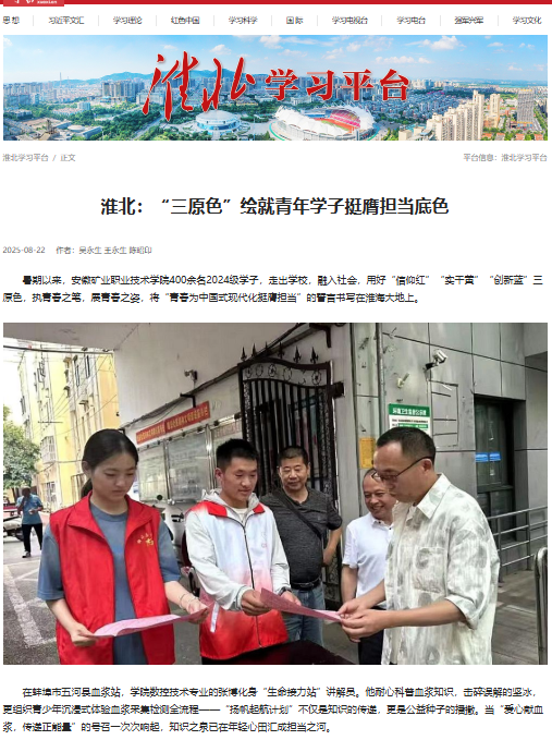 从血浆站的科普讲台、社区街巷的扫帚,到医院的导诊台、敬老院的嘘寒问暖,再到防溺水河道巡查的脚印,安徽矿业职业技术学院的大学生以行动为笔、以爱心为墨,描绘出担当社会责任的新画卷。