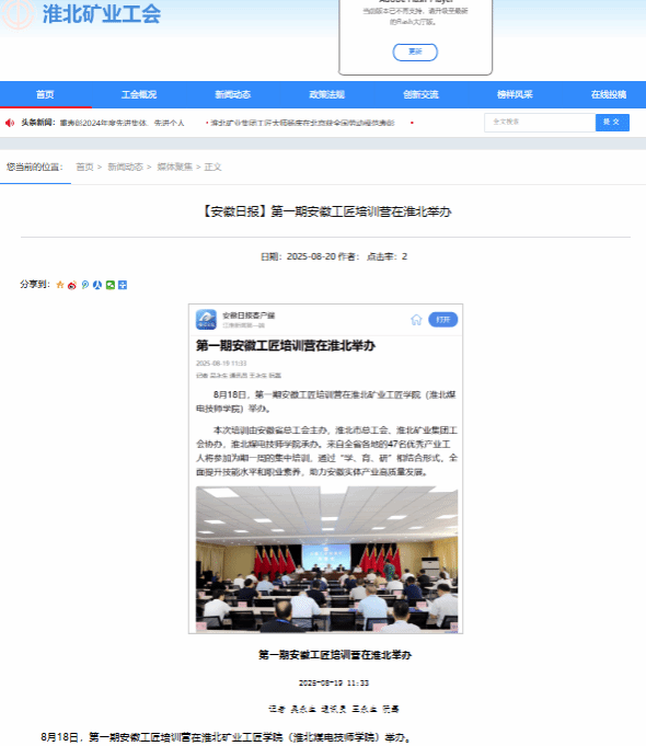 第一期安徽工匠培训营在淮北举办2025-08-19记者 吴永生 通讯员 王永生 阮磊8月18日,第一期安徽工匠培训营在淮北矿业工匠学院(淮北煤电技师学院)举办。