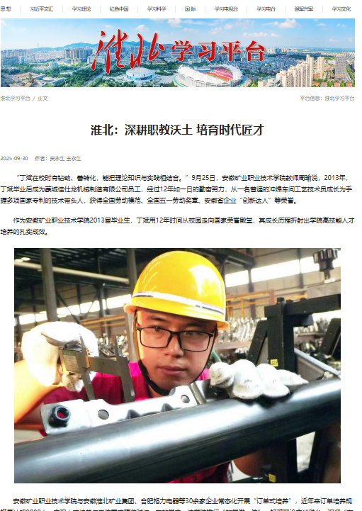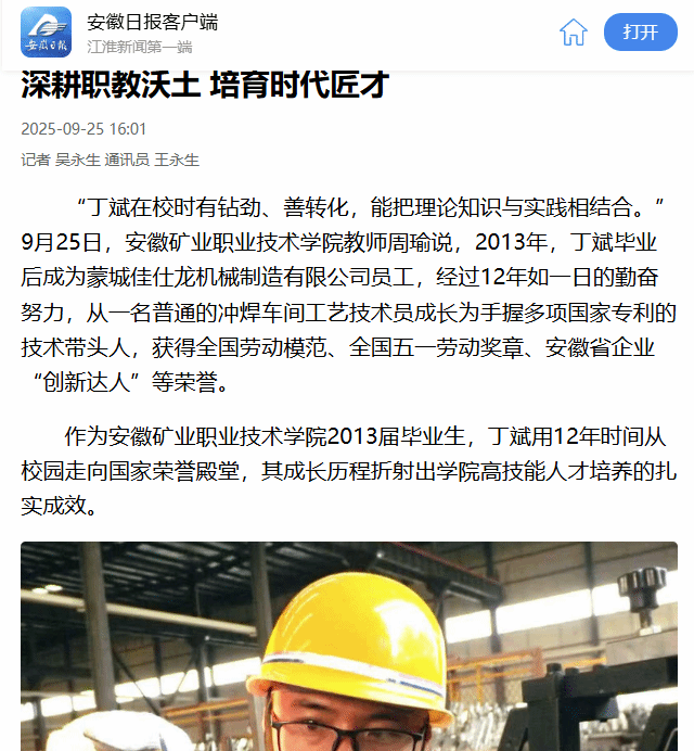 作为安徽矿业职业技术学院2013届毕业生,丁斌用12年时间从校园走向国家荣誉殿堂,其成长历程折射出学院高技能人才培养的扎实成效。