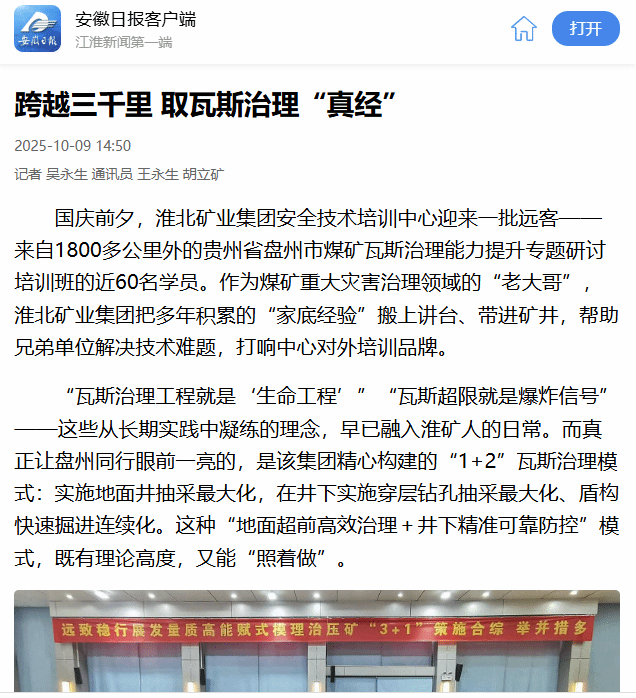 “瓦斯治理工程就是‘生命工程’”“瓦斯超限就是爆炸信号”——这些从长期实践中凝练的理念,早已融入淮矿人的日常。而真正让盘州同行眼前一亮的,是该集团精心构建的“1+2”瓦斯治理模式:实施地面井抽采最大化,在井下实施穿层钻孔抽采最大化、盾构快速掘进连续化。这种“地面超前高效治理+井下精准可靠防控”模式,既有理论高度,又能“照着做”。