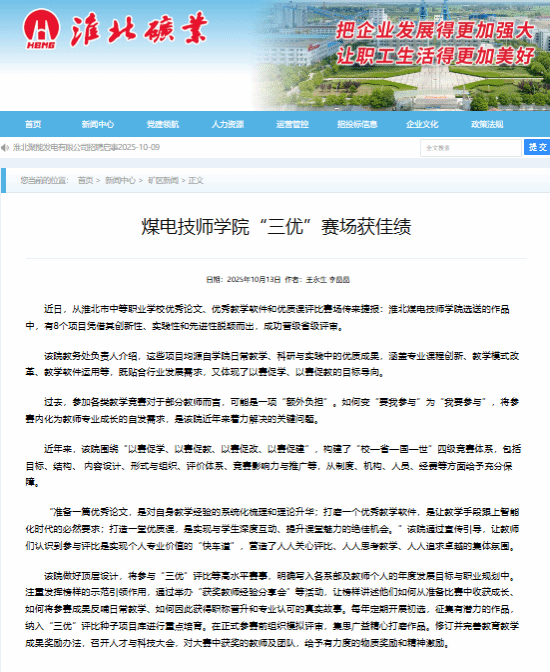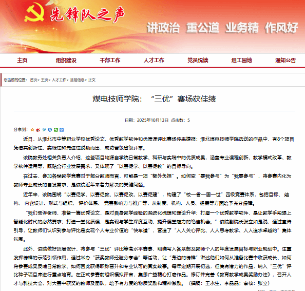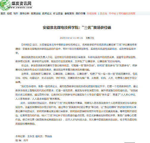近日,从淮北市中等职业学校优秀论文、优秀教学软件和优质课评比赛场传来捷报:淮北煤电技师学院选送的作品中,有8个项目凭借其创新性、实践性和先进性脱颖而出,成功晋级省级评审。