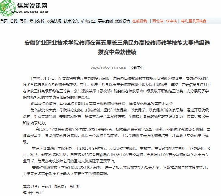 【本网讯】近日,在安徽省教育厅主办的第五届长三角民办高校教师教学技能大赛省级选拔赛中,安徽矿业职业技术学院选派的3名教师全部获奖。其中,机电工程系陈玉宝老师获理科中级及以下职称组二等奖,管理信息系汪丹丹老师获工科高级职称组三等奖,公共课教学部(思政部)陈斐然老师获思政中级及以下职称组三等奖,充分展现了学院教师扎实的教学功底和良好的精神风貌。