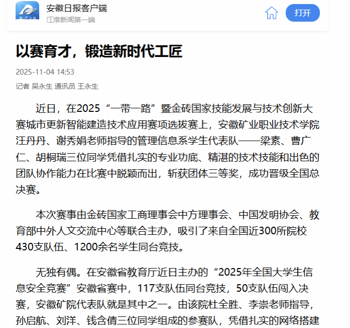 近日,在2025“一带一路”暨金砖国家技能发展与技术创新大赛城市更新智能建造技术应用赛项选拔赛上,安徽矿业职业技术学院汪丹丹、谢秀娟老师指导的管理信息系学生代表队——梁素、曹广仁、胡桐瑞三位同学凭借扎实的专业功底、精湛的技术技能和出色的团队协作能力在比赛中脱颖而出,斩获团体三等奖,成功晋级全国总决赛。