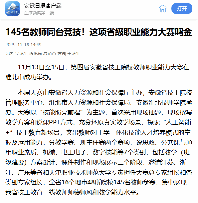 11月13日至15日,第四届安徽省技工院校教师职业能力大赛在淮北市成功举办。
