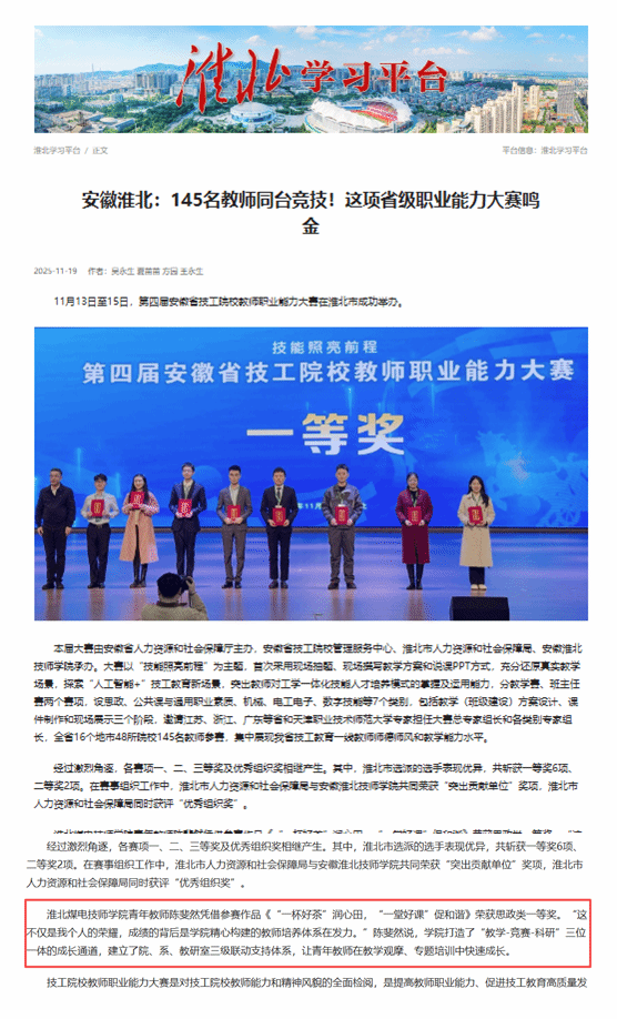 淮北煤电技师学院青年教师陈斐然凭借参赛作品《“一杯好茶”润心田,“一堂好课”促和谐》荣获思政类一等奖。“这不仅是我个人的荣耀,成绩的背后是学院精心构建的教师培养体系在发力。”陈斐然说,学院打造了“教学-竞赛-科研”三位一体的成长通道,建立了院、系、教研室三级联动支持体系,让青年教师在教学观摩、专题培训中快速成长。