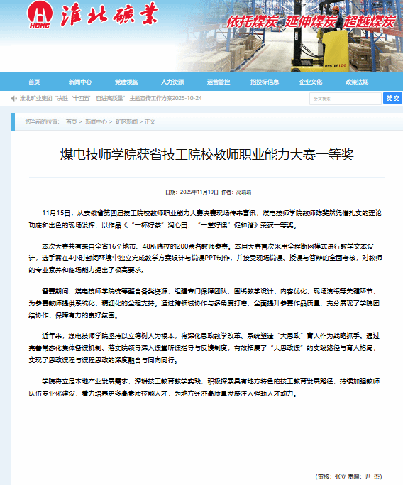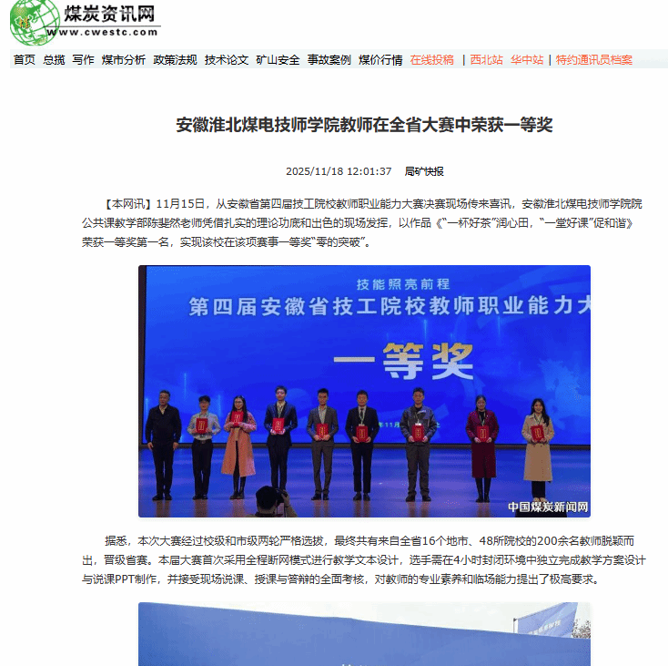 11月15日,从安徽省第四届技工院校教师职业能力大赛决赛现场传来喜讯,煤电技师学院教师陈斐然凭借扎实的理论功底和出色的现场发挥,以作品《“一杯好茶”润心田,“一堂好课”促和谐》荣获一等奖。