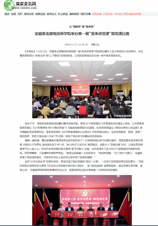 11月12日,淮北煤电技师学院第一届“我来讲党课”微党课比赛在工匠大师报告厅成功举办,标志着党课教育从“领导主讲”到“上下联动”的深刻转变,让党的创新理论在扎根一线中焕发勃勃生机。