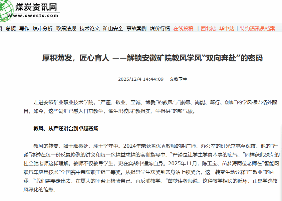 走进安徽矿业职业技术学院,“严谨、敬业、至诚、博爱”的教风与“崇德、尚能、笃行、创新”的学风标语格外醒目。如今,这些词汇已融入日常教学,催生出校园“教得实、学得拼”的新气象。