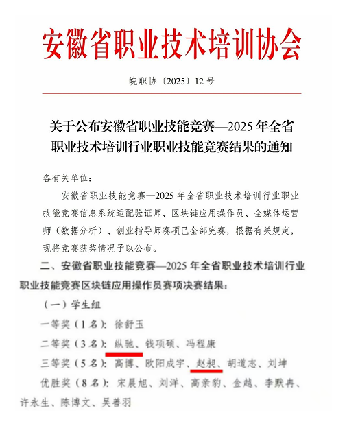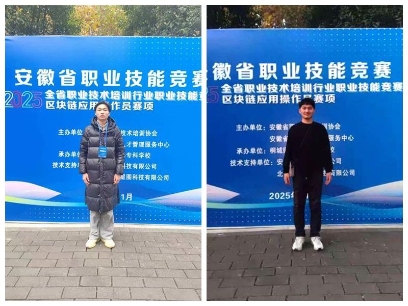 近日,2025年安徽省区块链应用操作员职业技能竞赛圆满落幕,淮北煤电技师学院选手在全省90组选手的激烈角逐中脱颖而出。纵驰、赵昶两位同学在指导教师苏鑫、许可的精心指导下,分获二等奖和三等奖,充分展现了学院在数字技术技能人才培养上的扎实成效。
