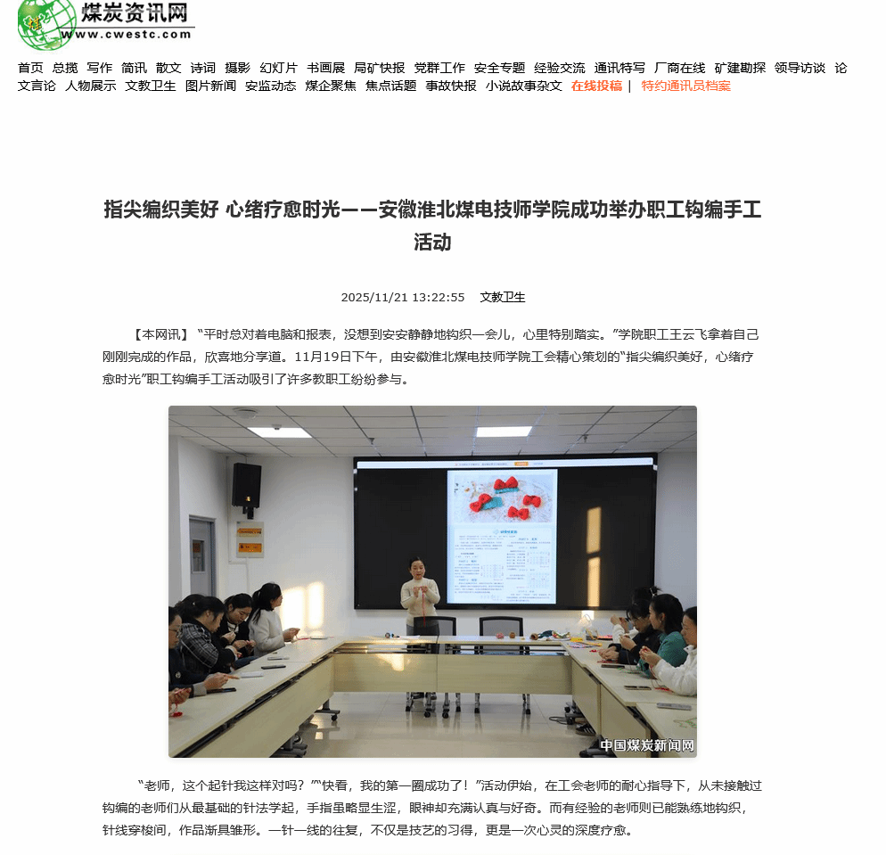 “平时总对着电脑和报表,没想到安安静静地钩织一会儿,心里特别踏实。”学院职工王云飞拿着自己刚刚完成的作品,欣喜地分享道。11月19日下午,由煤电技师学院工会精心策划的“指尖编织美好,心绪疗愈时光”职工钩编手工活动吸引了许多教职工纷纷参与。