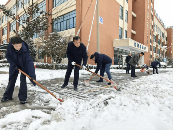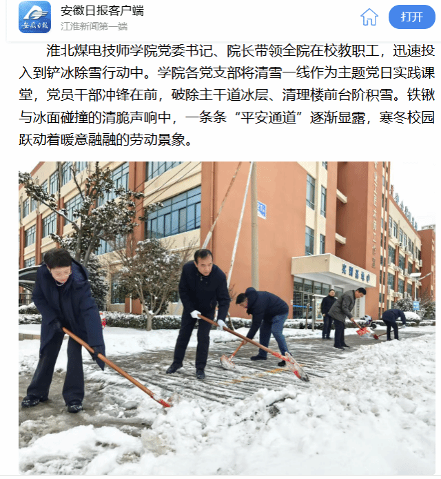 淮北煤电技师学院党委书记、院长带领全院在校教职工,迅速投入到铲冰除雪行动中。学院各党支部将清雪一线作为主题党日实践课堂,党员干部冲锋在前,破除主干道冰层、清理楼前台阶积雪。铁锹与冰面碰撞的清脆声响中,一条条“平安通道”逐渐显露,寒冬校园跃动着暖意融融的劳动景象。