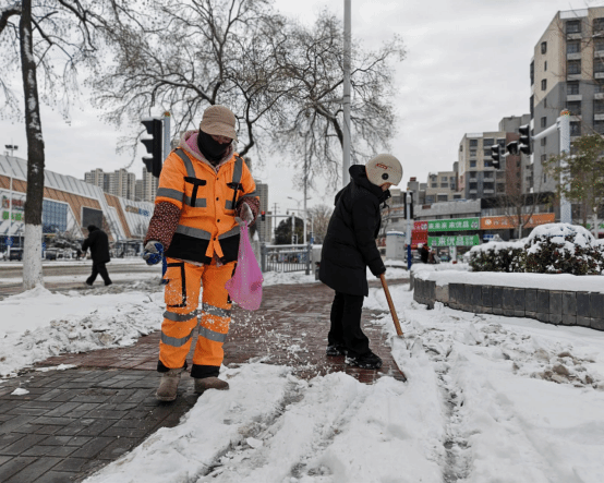 “我们东片区有30名环卫工人,凌晨4点就都上路作业了。”同盈环境东片区主管周梅梅说,沿着人行道中线撒布融雪剂,等积雪松动了再拿铁锨铲,这样能快速扫除便民路。