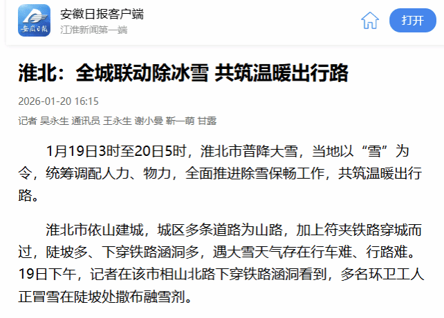 1月19日3时至20日5时,淮北市普降大雪,当地以“雪”为令,统筹调配人力、物力,全面推进除雪保畅工作,共筑温暖出行路。