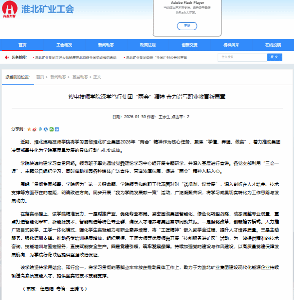 近期,淮北煤电技师学院将学习贯彻淮北矿业集团2026年“两会”精神作为核心任务,聚焦“学懂、弄通、做实”,着力推动集团决策部署转化为学院高质量发展的具体行动与扎实成效。