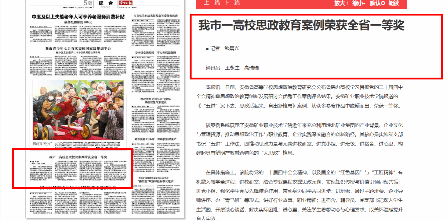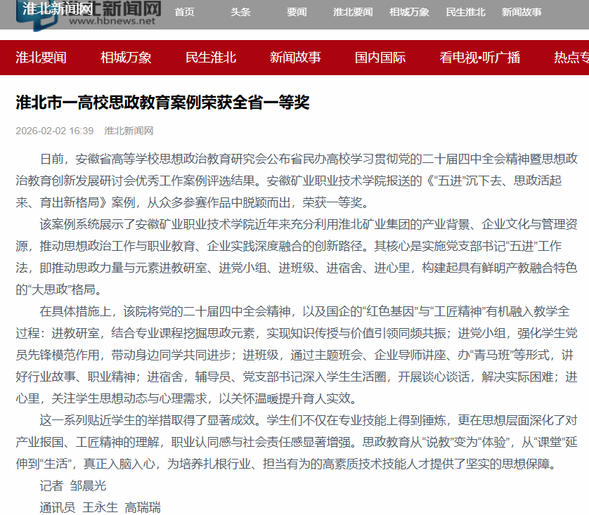 日前,安徽省高等学校思想政治教育研究会公布省民办高校学习贯彻党的二十届四中全会精神暨思想政治教育创新发展研讨会优秀工作案例评选结果。安徽矿业职业技术学院报送的《“五进”沉下去、思政活起来、育出新格局》案例,从众多参赛作品中脱颖而出,荣获一等奖。