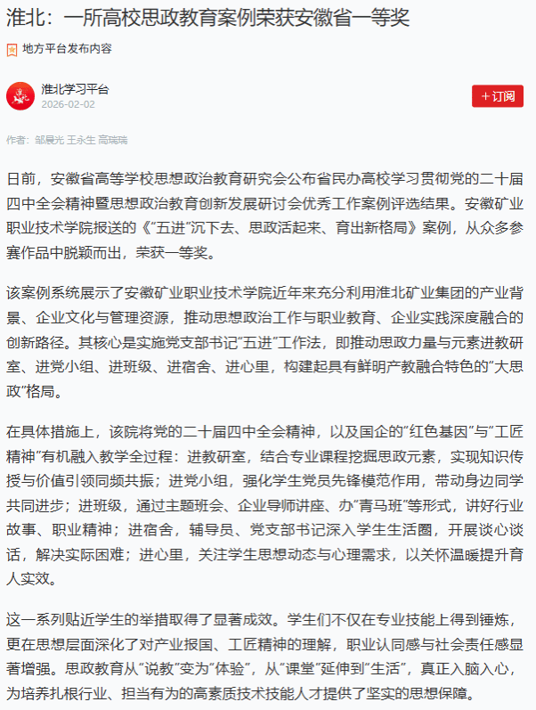 该案例系统展示了安徽矿业职业技术学院近年来充分利用淮北矿业集团的产业背景、企业文化与管理资源,推动思想政治工作与职业教育、企业实践深度融合的创新路径。其核心是实施党支部书记“五进”工作法,即推动思政力量与元素进教研室、进党小组、进班级、进宿舍、进心里,构建起具有鲜明产教融合特色的“大思政”格局。