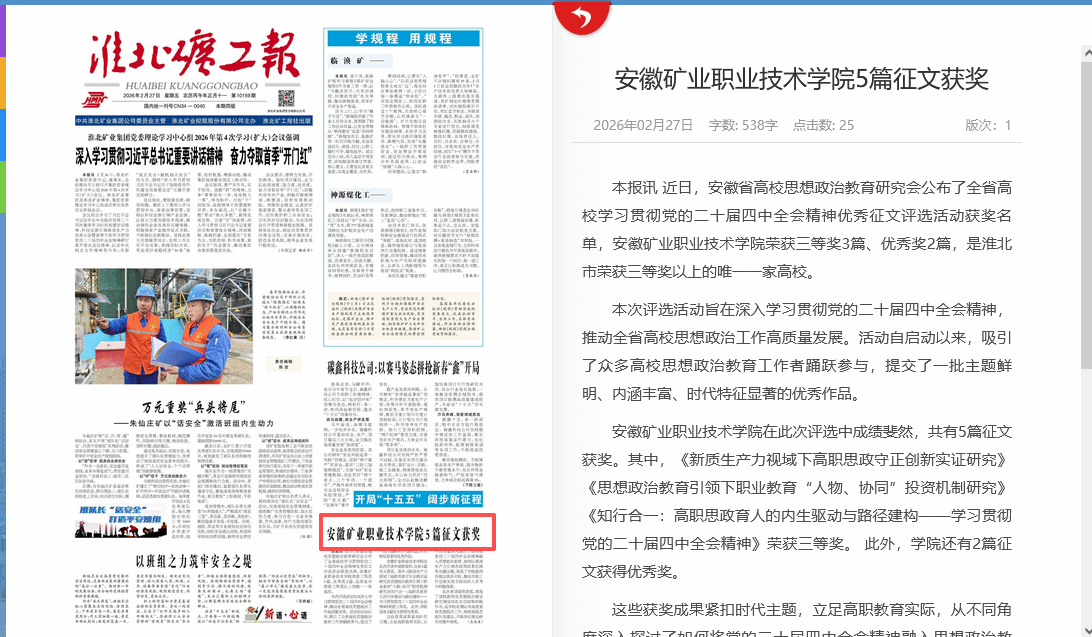 近日,安徽省高校思想政治教育研究会公布了全省高校学习贯彻党的二十届四中全会精神优秀征文评选活动获奖名单,安徽矿业职业技术学院荣获三等奖3篇、优秀奖2篇,是淮北市荣获三等奖以上的唯一一家高校。