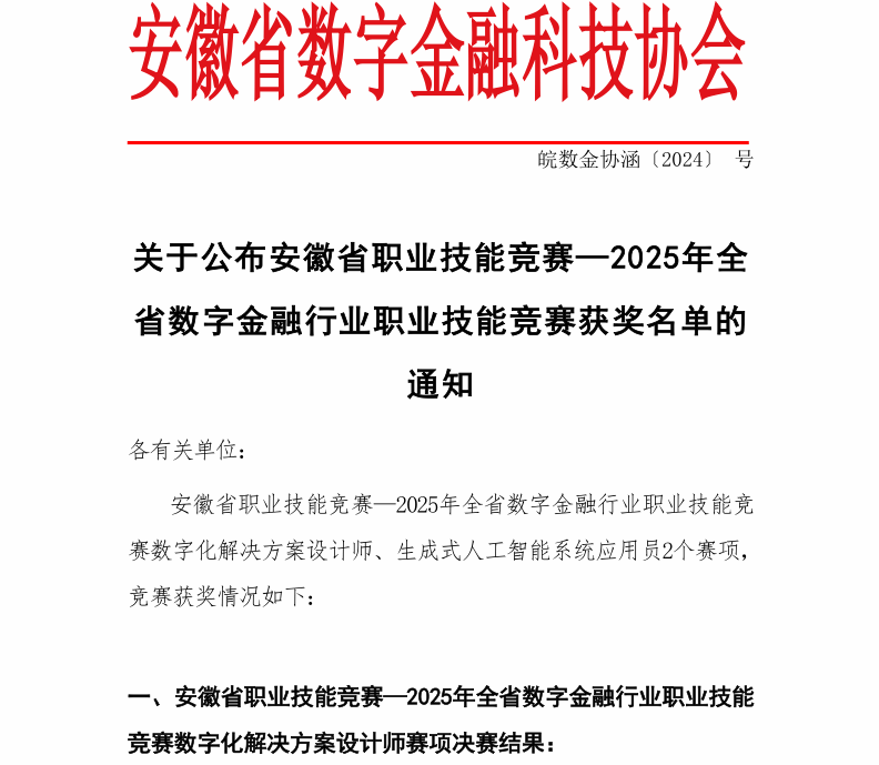 近日,安徽省职业技能竞赛—2025年全省数字金融行业职业技能竞赛获奖名单公布,我院参赛选手表现亮眼,斩获省级二等奖、三等奖各1项,彰显了学院技能人才培养的突出成果。