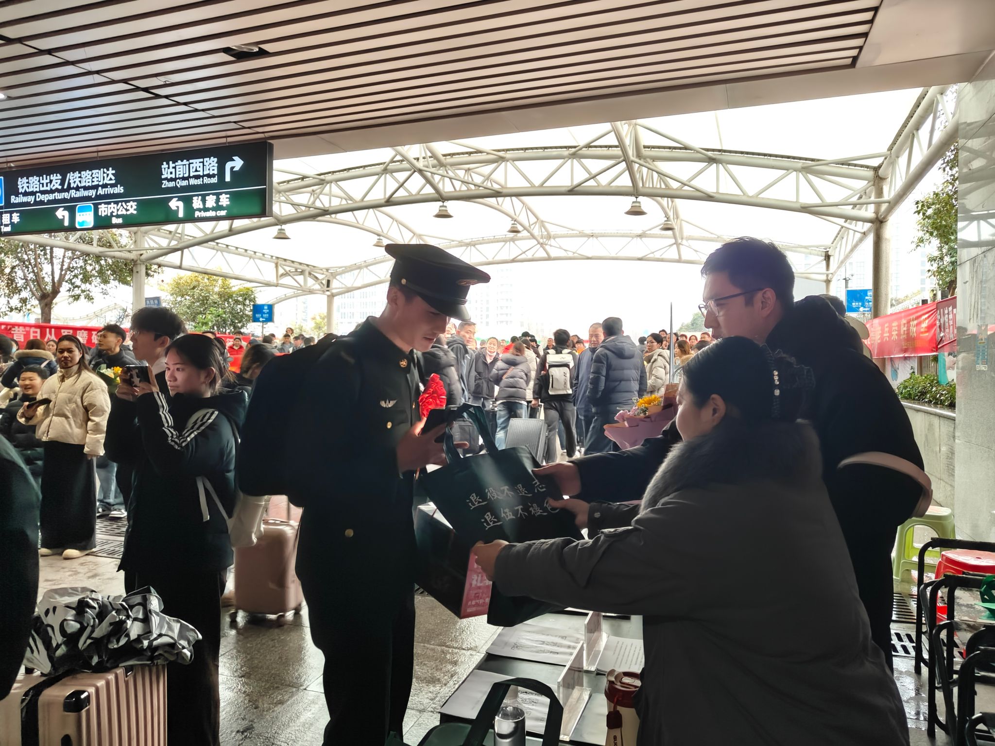 迎接现场氛围浓厚,学院工作人员为返乡老兵送上鲜花,主动帮助搬运行李、亲切交流,让老兵们一出站就感受到来自家乡与学院的诚挚敬意与贴心关怀。