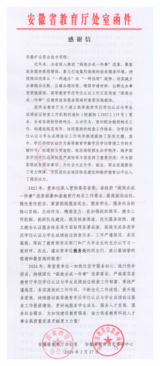 近日,安徽矿业职业技术学院收到省教育厅办公室和省教育信息咨询中心联合发来的感谢信。