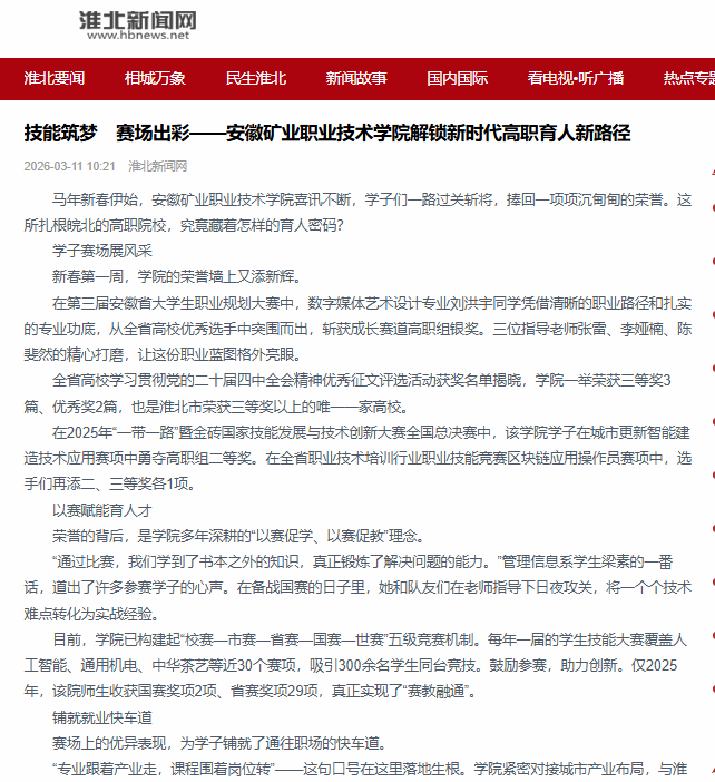 马年新春伊始,安徽矿业职业技术学院喜讯不断,学子们一路过关斩将,捧回一项项沉甸甸的荣誉。这所扎根皖北的高职院校,究竟藏着怎样的育人密码?
