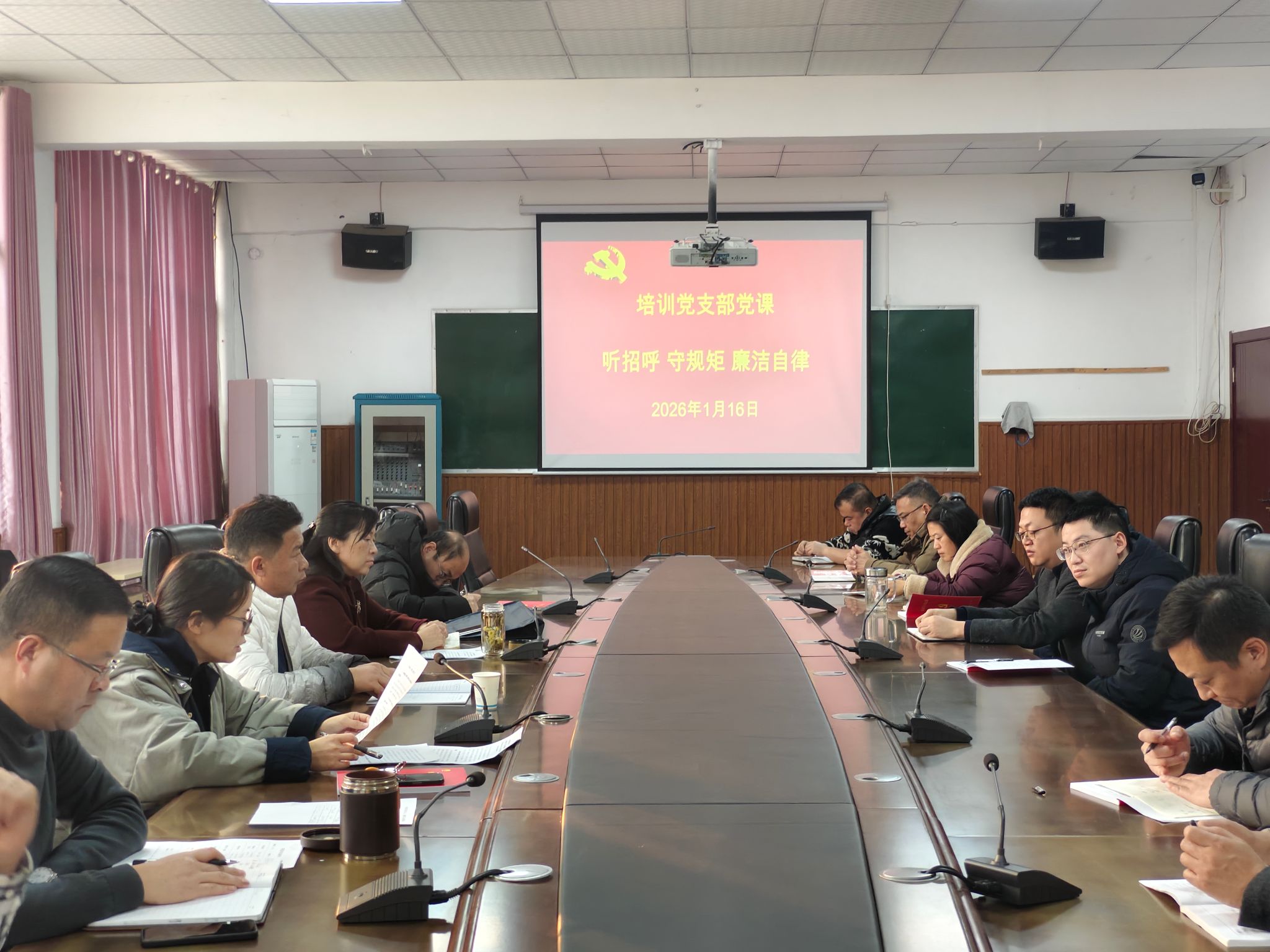 1月16日下午,培训党支部开展“听招呼、守规矩、廉洁自律”专题党课。支部书记结合部门实际宣讲,引导党员干部筑牢思想防线、强化纪律意识,以忠诚干净担当作风助力部门高质量发展。