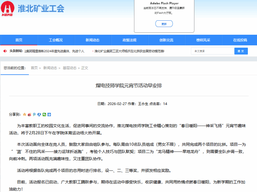 为丰富教职工的校园文化生活,促进同事间的交流协作,淮北煤电技师学院工会精心策划的“春日暖阳——神采飞扬”元宵节趣味活动,将于2月28日下午在学院体育运动场火热开展。
