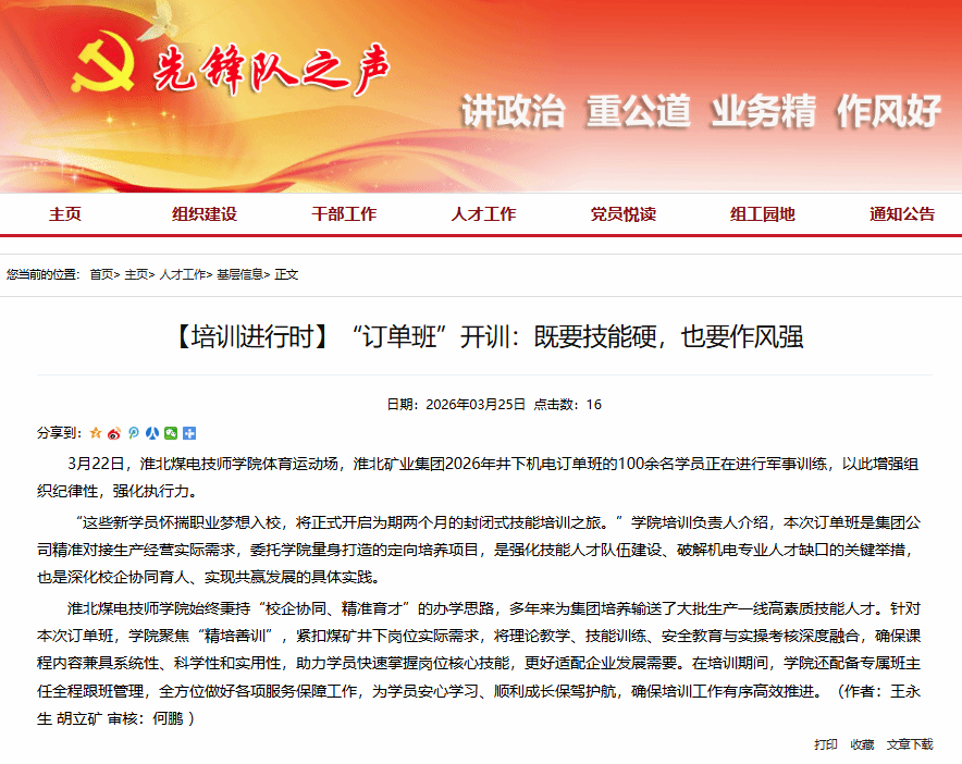 3月22日,淮北煤电技师学院体育运动场,淮北矿业集团2026年井下机电订单班的100余名学员正在进行军事训练,以此增强组织纪律性,强化执行力。