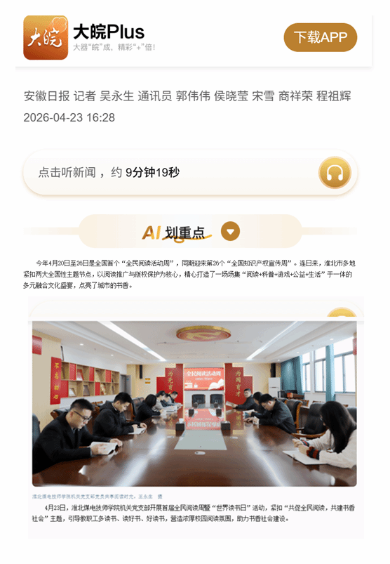 4月23日,淮北煤电技师学院机关党支部开展首届全民阅读周暨“世界读书日”活动,紧扣“共促全民阅读,共建书香社会”主题,引导教职工多读书、读好书、好读书,营造浓厚校园阅读氛围,助力书香社会建设。