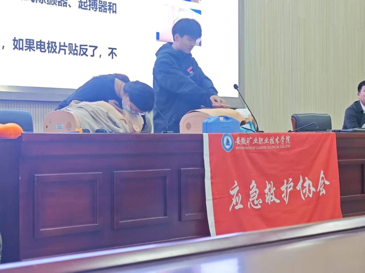 活动中,李永老师结合校园生活实际,围绕心肺复苏、气道异物梗阻处理、创伤包扎等常见急救技能展开讲解。他通过生动的案例分析,强调了“黄金救援时间”的重要性,并系统演示了操作流程与关键要点。应急救护社团的同学们配合李老师的讲解,利用人体模型和急救器材,分步骤展示了规范的动作要领,使理论知识更加直观易懂。